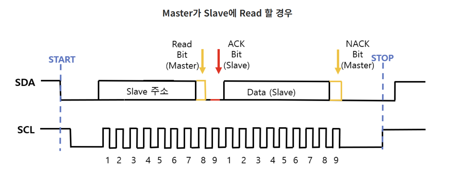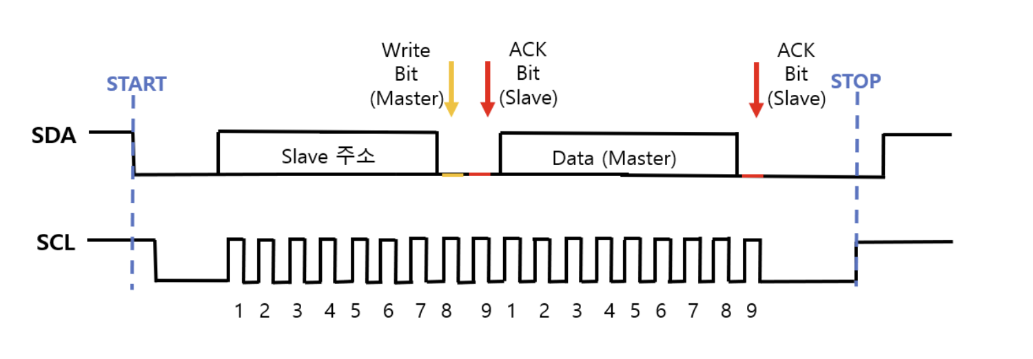 - 끝내고 싶은 경우엔 SDA가 Low인 상태에서 SCL이 High로 바꾸고 계속 유지하면 끝났다는 걸 Slave가