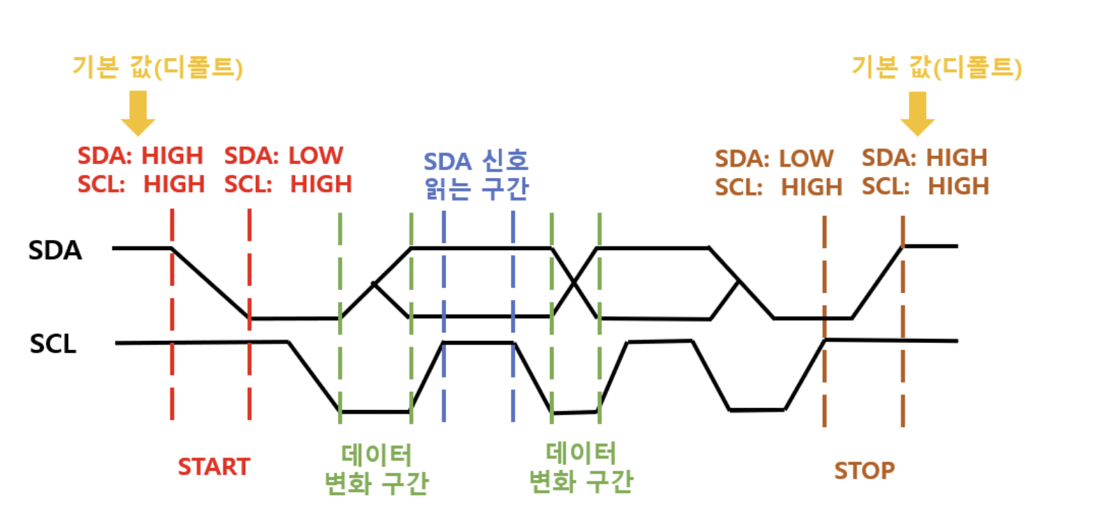 : SCL(클럭) 선을 Low로 떨어트리고 그 위에 SDA에서 데이터 세팅하고 나면 SCL은 다시 High로 올려줌 - SDA 신호 읽는 구간