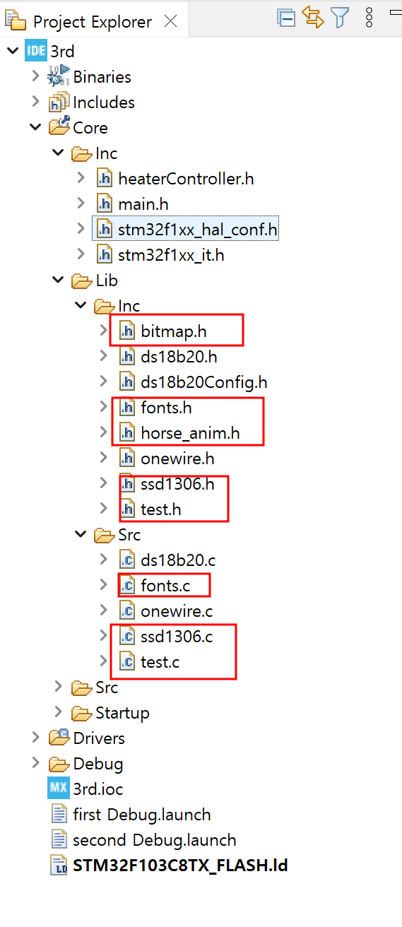 - 사진3처럼 STM 내 Lib-Inc에 넣기 (fonts.h, ssd1306.h, test.h : Inc 폴더에서, bitmap.h, horse_anim.h : Src 폴더에서)