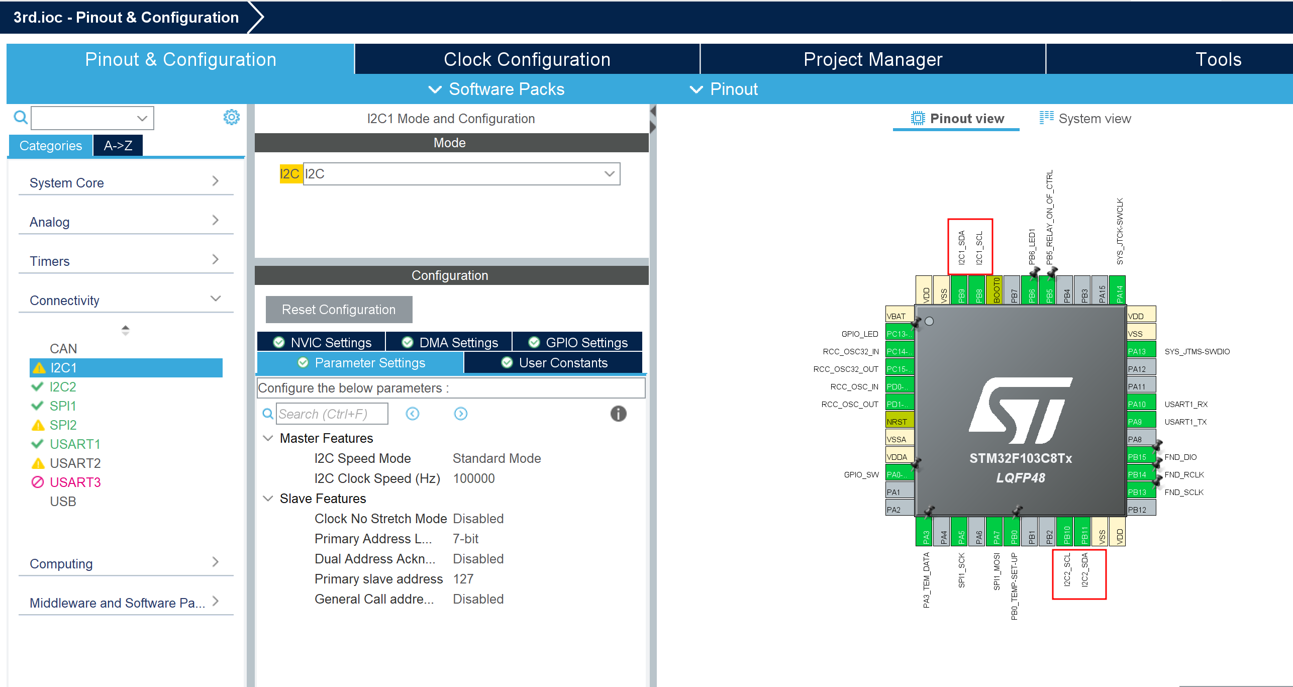 - 다시 파랑, 초록 수컷-암컷 점퍼선으로 빵판의 i50/49와 stm PCB의 PB10/PB11에 연결
