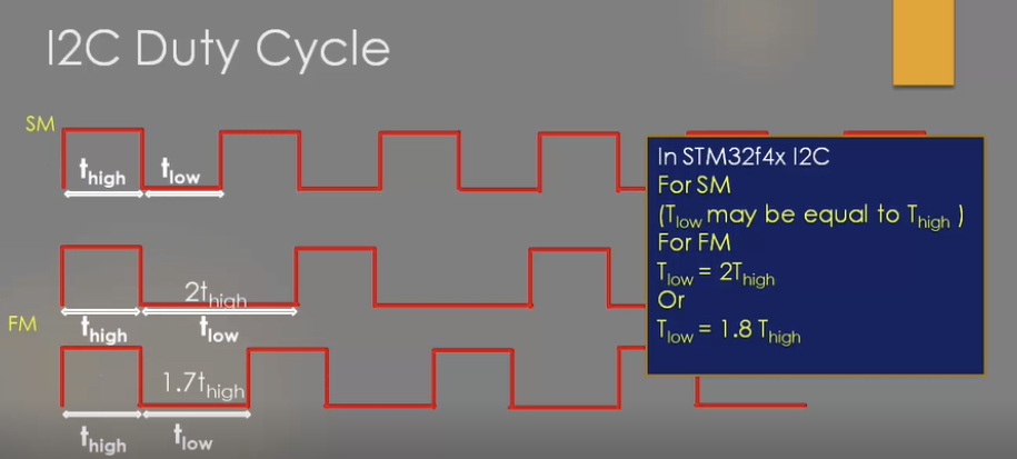: FM(Fast Mode)에서는 High, Low Edge가 1:2 / 1:1.7 비율로 사이클 구성 - 400kHz : 1초에 400만 주기 (= 0.0000025 초) <=> 1사이클에 0.0000025초가 되어야 400kHz를 만들 수 있다