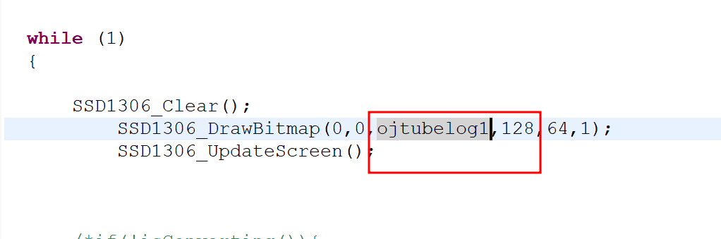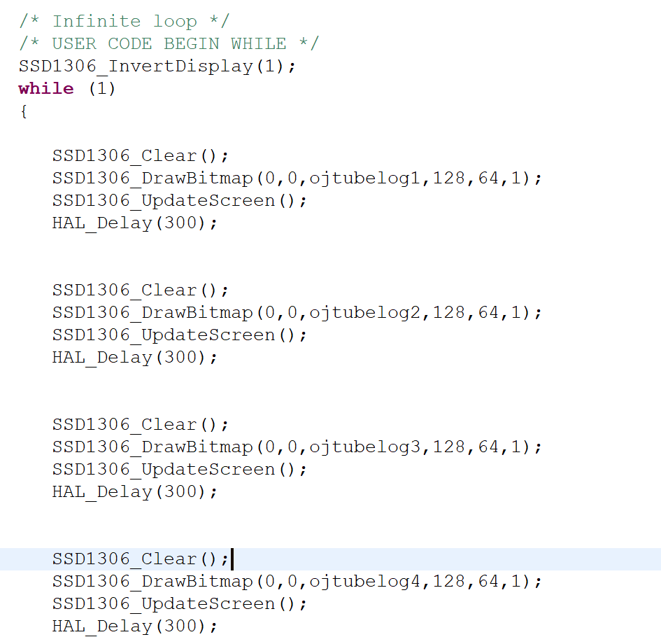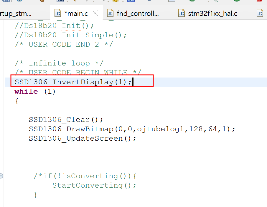 => 아까 사이트를 이용해 다시 코드 생성 or OLED 기능 이용(우리 pick) - SSD1306_InvertDisplay(1):을 while문 앞에 추가해줌