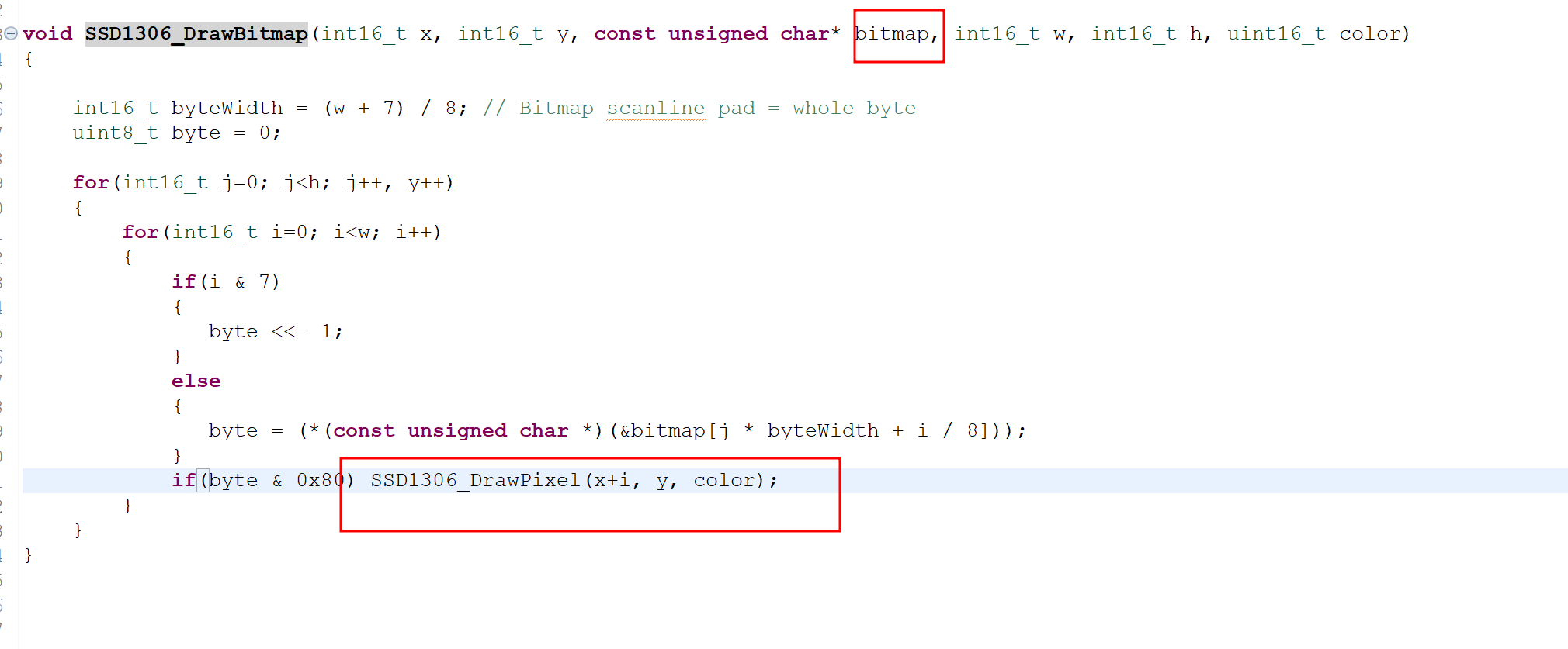 - 사진2에서의 DrawBitmap은 해당 함수 내의 SSD1306_DrawPixel 함수를 통해 우리가 보낼 데이터들을 저장할 버퍼에 담는 작업을 함