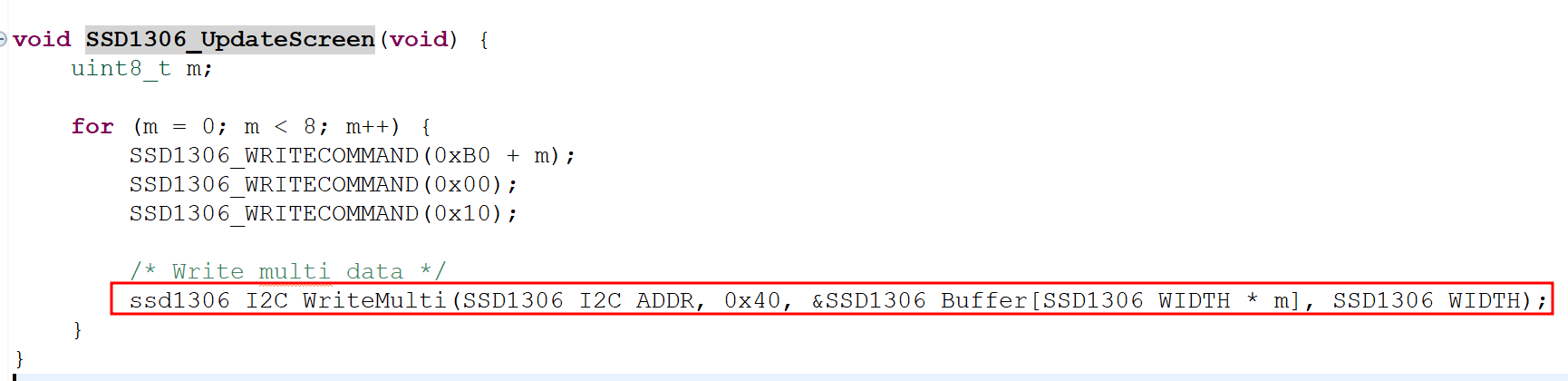 => 최종적으로 SSD1306_Buffer에 저장하여 이 버퍼가 I2C 통신을 통해 LED 제어칩 SSD1306에 전달되는 것임