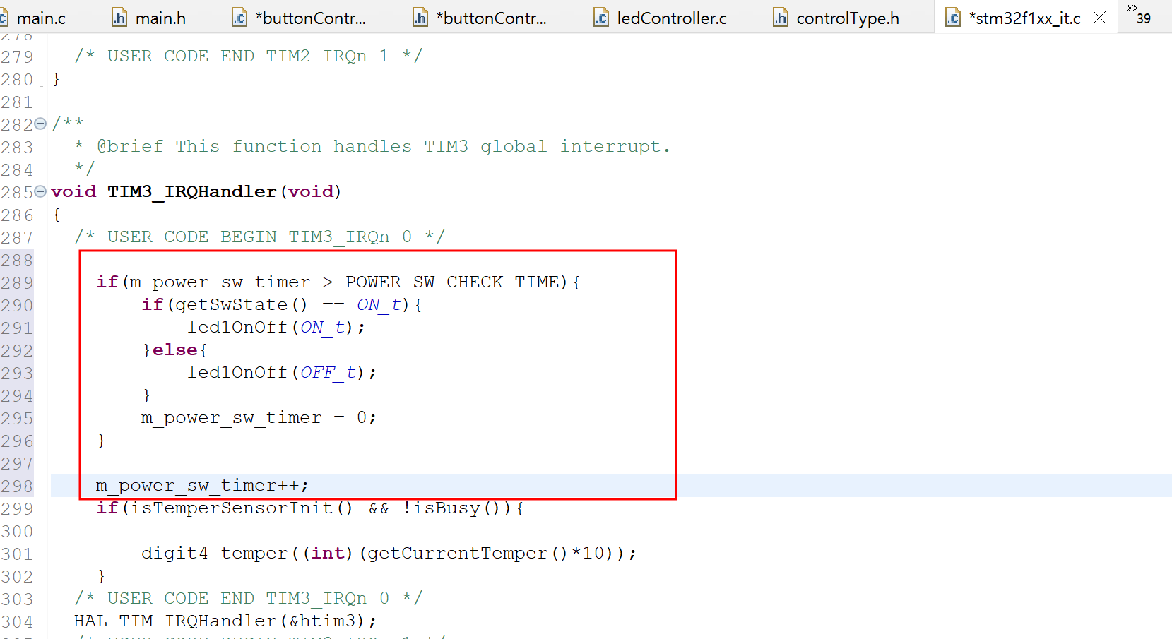 => 0.2초 내에 신호가 들어오면 그 신호는 무시하도록 - m_button_before_time = HAL_GetTick(); 추가