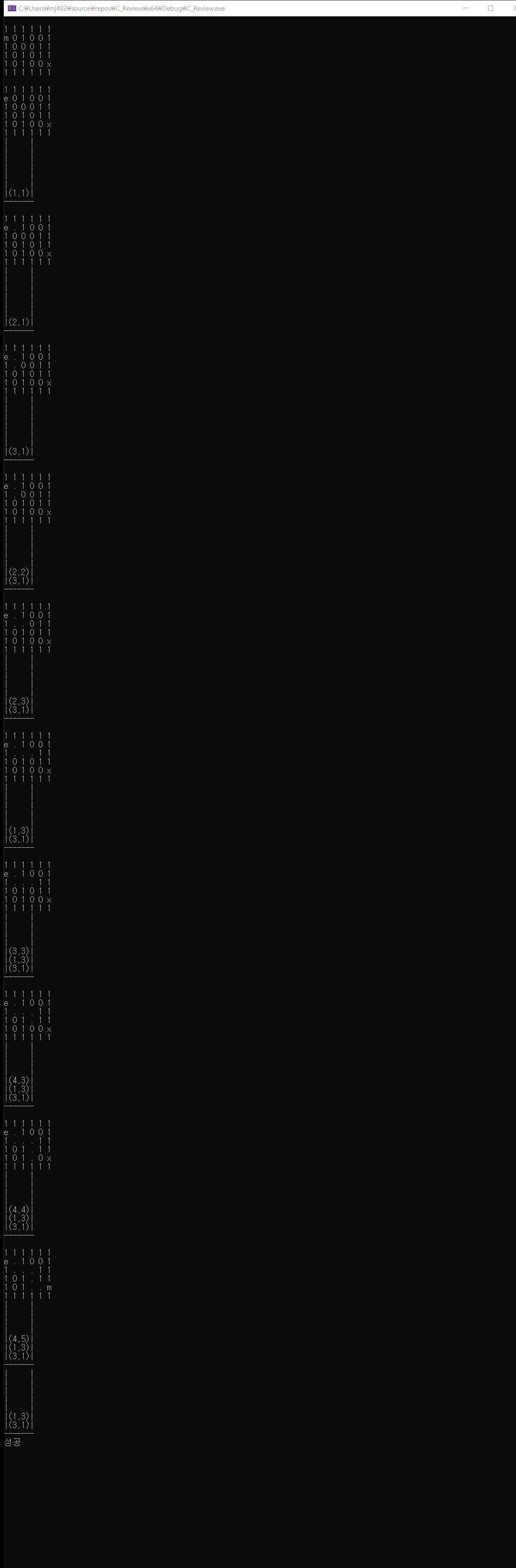 //출발 위치:e, 벽:1, 이동 가능한 곳:0, 출구:x, 방문한 곳:.